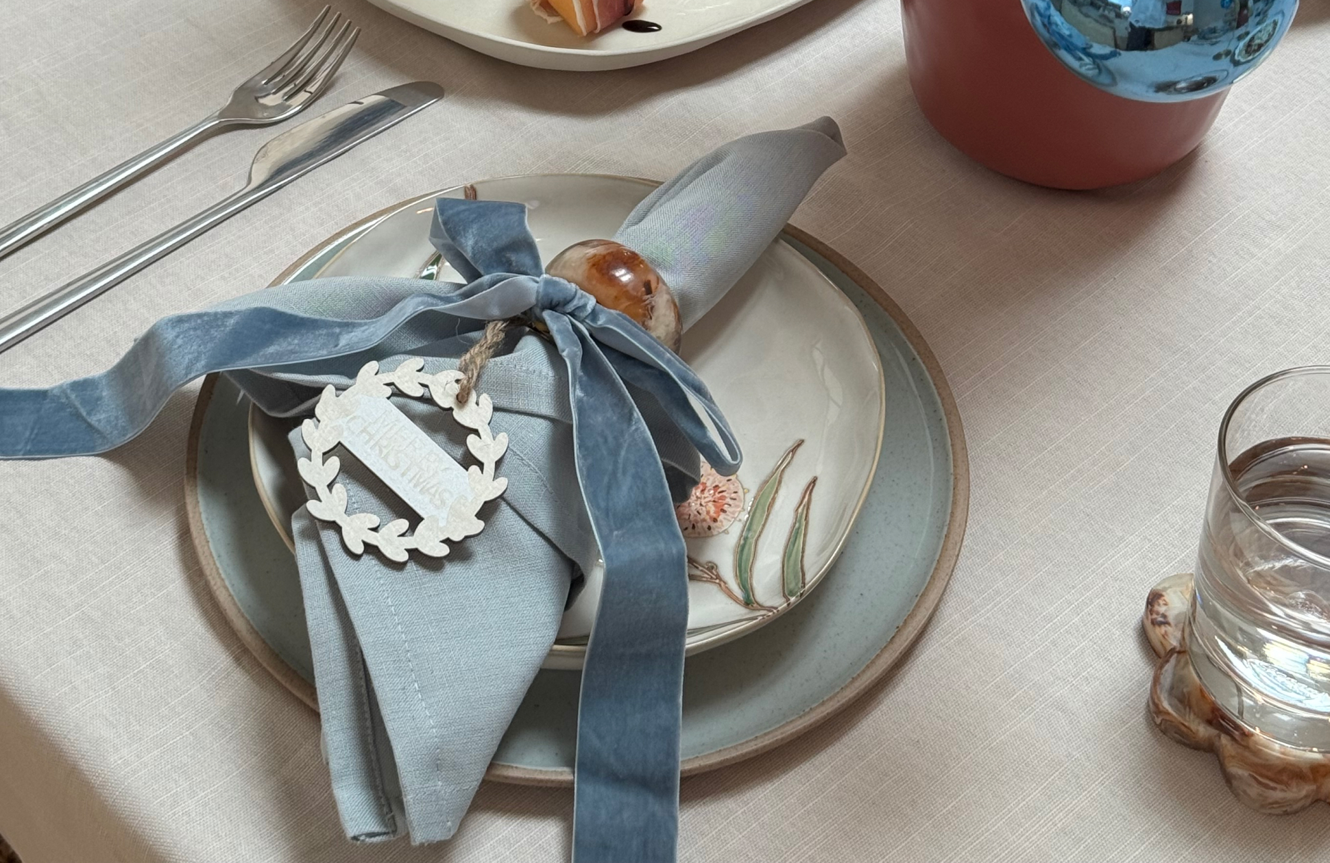 For a modern twist, be inspired by Hannah’s Australian flora table, incorporating native florals into her serving ware and table décor too. You can even add a traditional festive touch by hanging Christmas tree decorations from the floral branches, it’s an easy way to incorporate a touch of holiday spirit to your tablescape without overwhelming the space. Find decorations like these at Adairs, Bed Bath N' Table, TK Maxx, Target, David Jones and fresh florals at Deep Blue Florist.